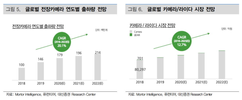 전장카메라(차량용카메라) 시장의 5개년 평균 성장률은 20%로, 그 부품인 카메라와 라이더 시장의 성장률은 12.7%입니다.