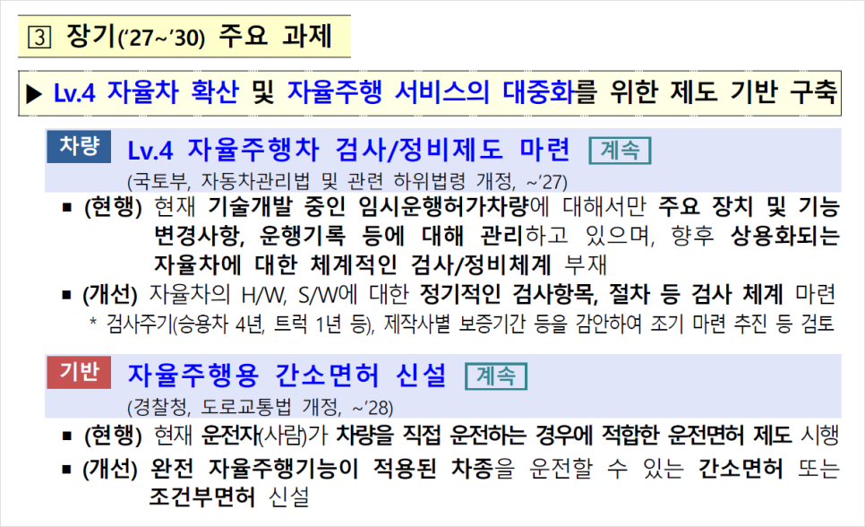 정부도 이에 맞춰 27~30년 장기 계획으로 레벨4 자율주행차 규제 및 제도 기반을 마련하고자 계획하고 있습니다.
