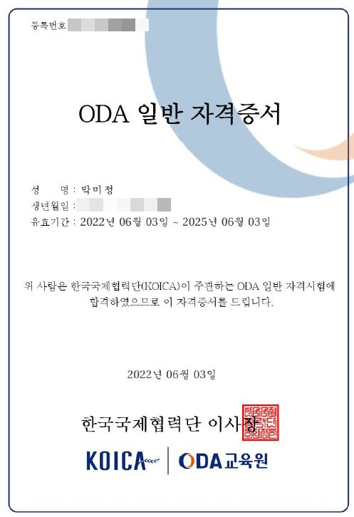 KOICAODA 교육원이 주관하는 국제개발협력에 대한 자격증이다.국제개발협력의 역사, 동향, 이슈를 다루고 있는 자격증이다.국제개발협력 이해, 국제개발협력 이슈 등 총 2과목이다.과목별 40문항, 총 80문항으로 과목당 60점의 점수를 넘어야 하며 평균 70점을 넘어야 합격 목걸이가 주어진다.