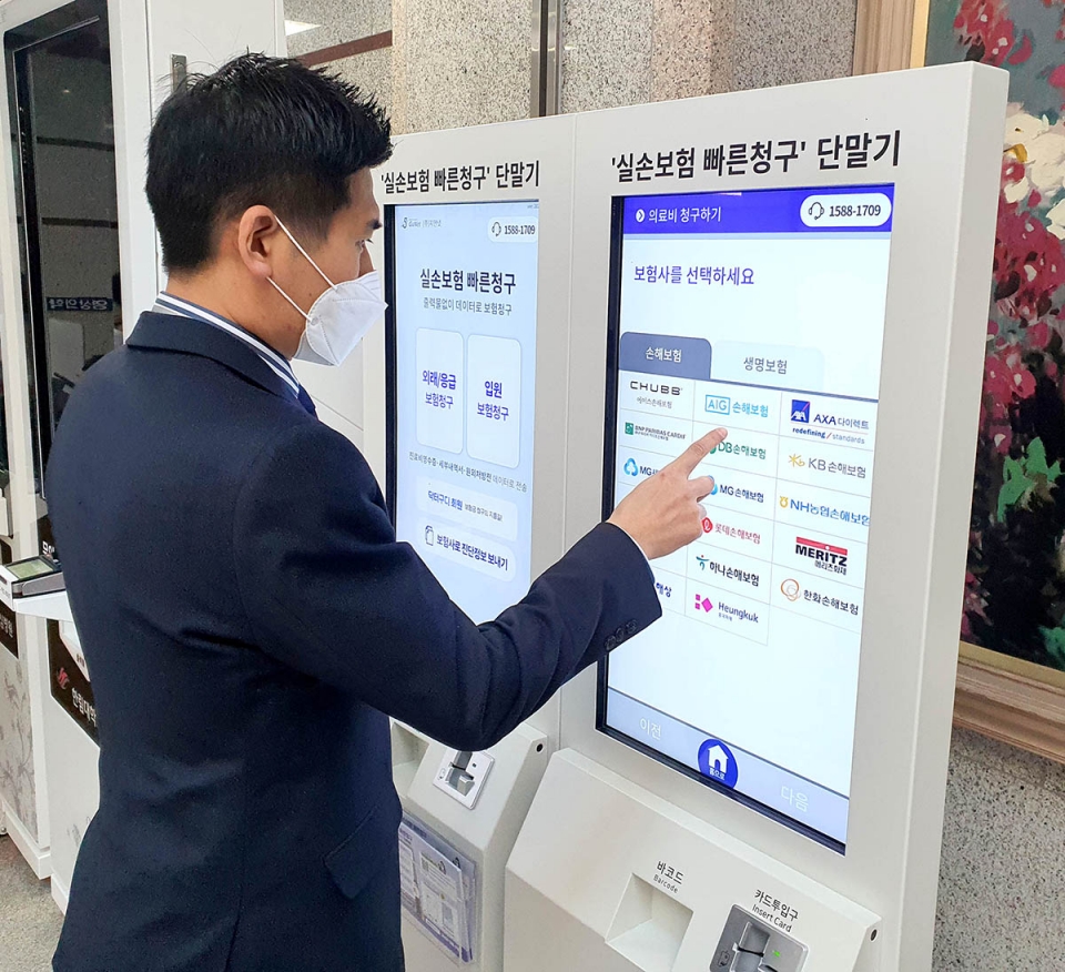 한림대 성심병원에서 병원 이용객이 키오스크를 통해 실손보험 청구를 하고 있다. [사진=한림대의료원 제공]한림대성심병원은 최근 비대면 의료서비스 고도화 측면에서 ‘실손보험 신속청구’ 서비스를 도입했다. 실손보험에 가입한 환자가 모바일 앱이나 병원 내 키오스크를 통해 보험금을 청구할 수 있는 서비스다.