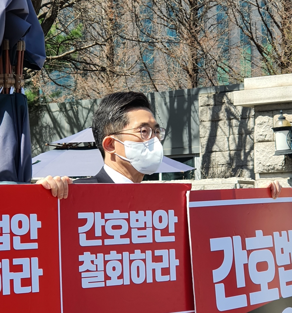 이필수 대한의사협회장이 28일 국회 앞에서 간호법 제정 반대 1인 릴레이 시위를 벌이고 있다.대한의사협회 간호단독법 저지 비상대책특별위원회가 다음달 3일 서울특별시의사회 5층 강당에서 ‘간호단독법 문제점 및 대체방안 마련’을 주제로 심포지엄을 개최한다. 이번 심포지엄은 간호단독법안 철회에 대한 당위성 논의를 통해 사회적 경각심을 높이기 위해 마련됐다. 간호단독법을 대신해 모든 보건의료인의 진료환경과 처우개선이 가능한 다양한 방안을 제시할 예정이다.