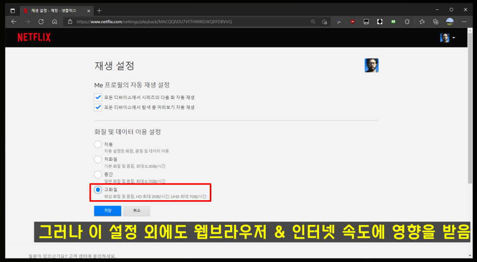 그리고 [재생설정]으로 이동하고 [화질 및 데이터 이용 설정]값을 자동에서 고화질로 바꾸고 [저장]버튼을 클릭한다.덧붙여, 각 설정은 어카운트 하나에 종속되는 것이 아니라, 각 프로필마다 따로 관리된다. 따라서 계정을 공유하고 있다면 다른 사용자들도 가장 해상도로 즐길 수 있도록 직접 변경하거나 해당 포스팅을 공유하는 감각을 발휘하자.하지만 어떤 웹 브라우저를 쓰느냐가 더 중요하다!