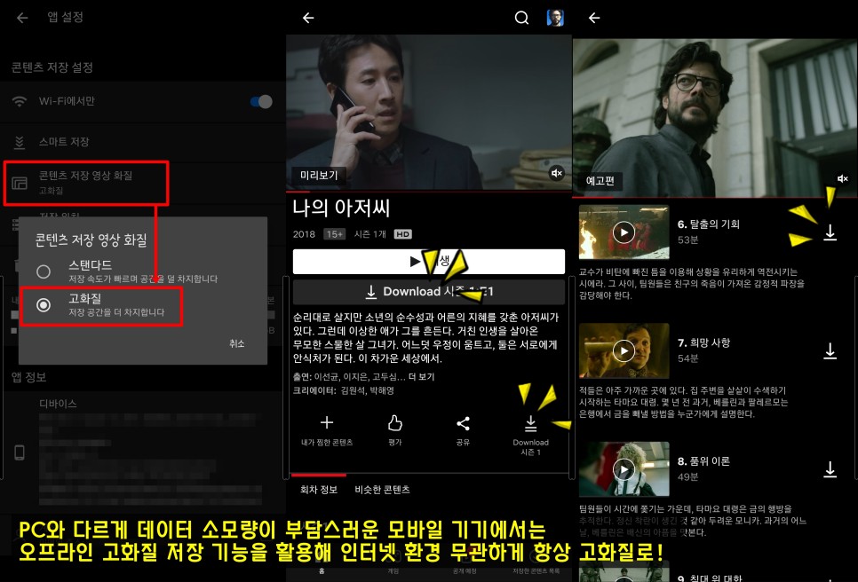 모바일로 데이터나 넷플릭스 화질 설정을 고민하지 않고 콘텐츠를 생생하게 즐기고 싶다면 오프라인 저장 기능이 답이 된다.[어플 설정 → 컨텐츠 저장 영상 화질]로 이동해, 「스탠다드」를 「고화질」로 바꾸자.
