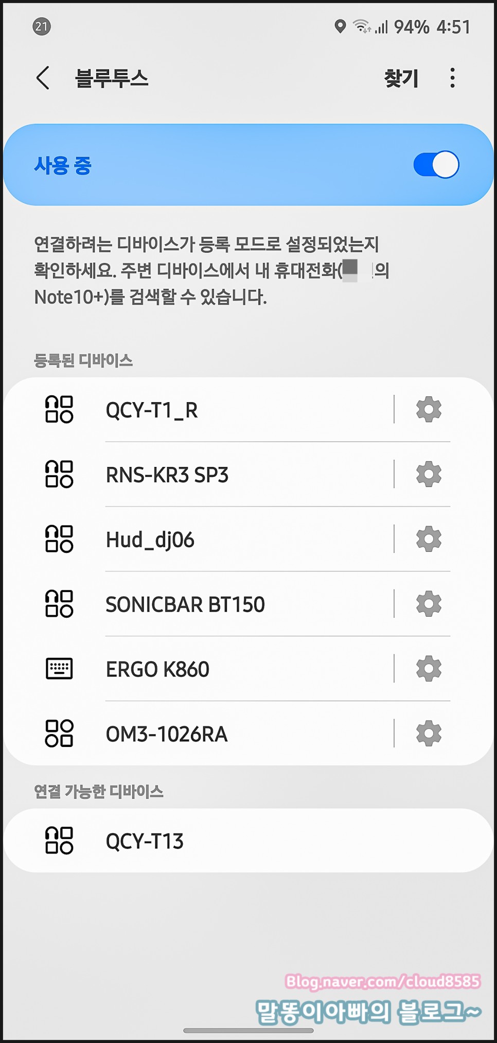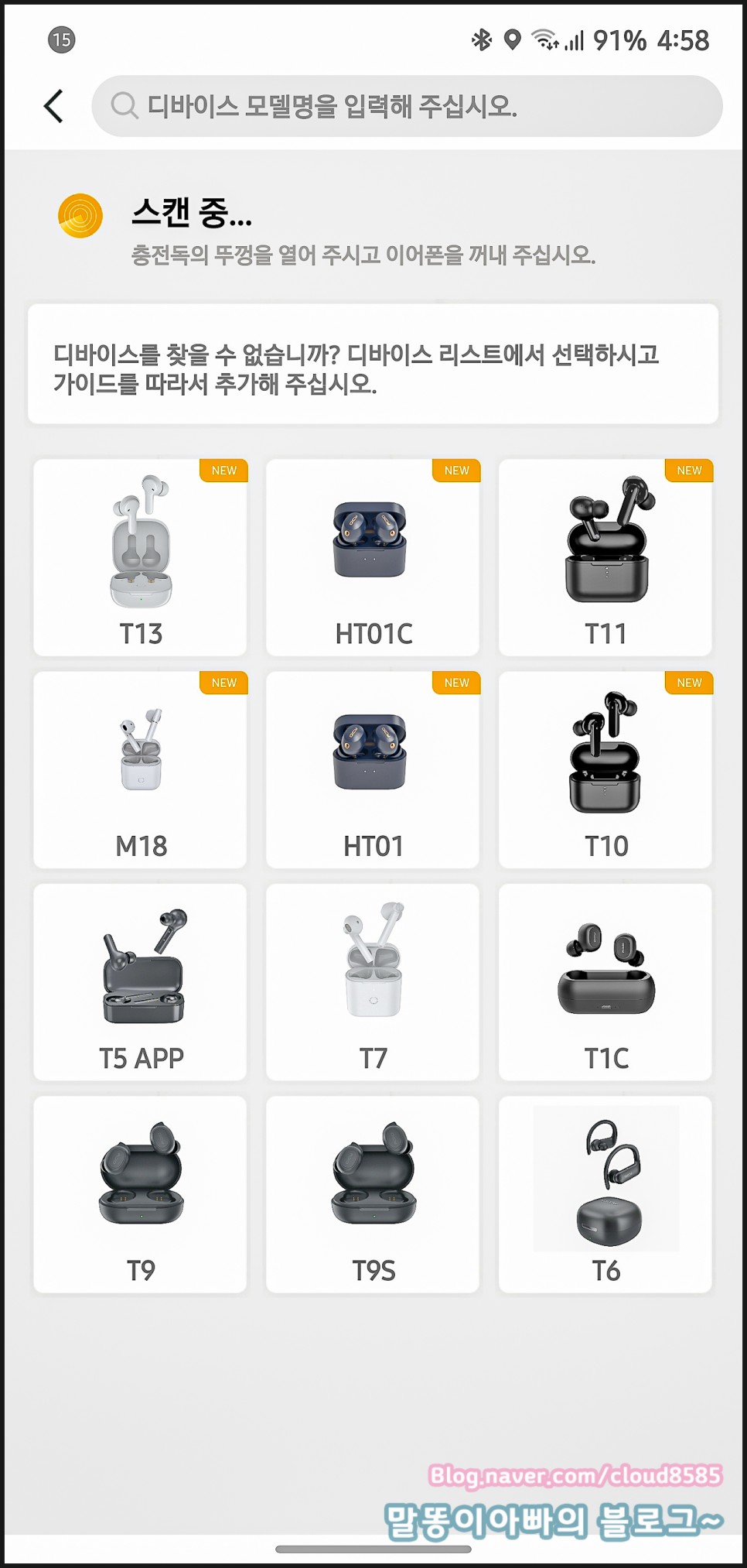 스마트폰으로 Bluetooth 검색하면 잠시 기다렸다가 아래의 항목이 표시됩니다. 저는 이제 T1을 사용하지 않기 때문에 삭제하고 새로 등록했습니다.