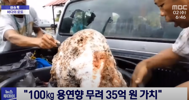 ©MBC 뉴스투데이가 점 때문에 바다의 로또 혹은 바다의 황금덩어리로 불릴 만큼 비싸게 팔린다. 가격의 경우 영영향이 얼마나 바다에 오래 머물렀는지, 그 무게가 얼마나 나가는지에 따라 몇 억원에서 몇 억원에 이른다.이처럼 용연향은 값비싸고 예로부터 바다의 신의 선물이라 일컬어져 왔다.
