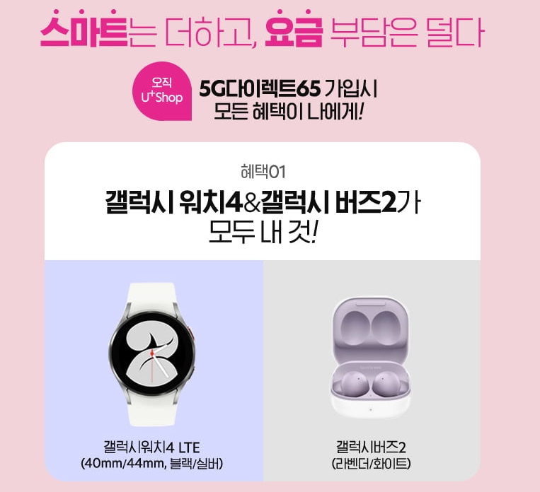<5G 다이렉트 65 요금제>는 U+Shop 전용 요금제로 데이터 무제한 요금제인데다 갤럭시 워치4 LTE&갤럭시 버즈2를 함께 사용할 수 있는 혜택을 받을 수 있습니다(갤럭시 팩을 선택할 경우). 하나도 아닌데 둘 다 쓸 수 있다니~ 대단하죠?@ >@