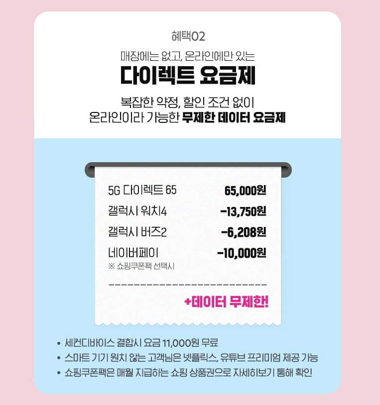 무제한 요금제라고 하면 거의 매달 10만원 정도 되지 않을까? 생각합니다만, 5G 다이렉트 65 요금제는 월 65,000원으로 저렴한 편!! 갤럭시 워치4와 갤럭시 버즈2 비용, 그리고 포함되어 있는 네이버페이 등 쇼핑 쿠폰팩 혜택까지 계산하면 대부분 실제 요금은 35.000원대로 무제한 요금제를 이용하신다고 보시면 될 것 같습니다.