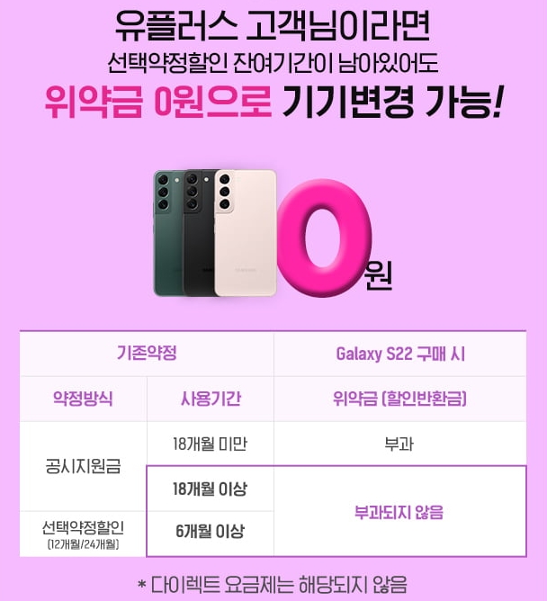 하나 더! 기존에 유플러스를 사용하셨던 분이라면 선택약정할인 잔여기간이 어느 정도 남아 있어도 위약금 0원으로 갤럭시S22 기기변경이 가능한 혹독해지는 혜택도~^^ * 공시지원금 이용시 18개월 이상 / 선택약정할인 6개월 이상 사용시