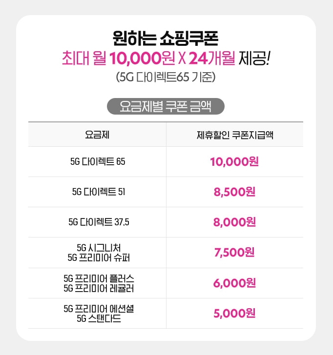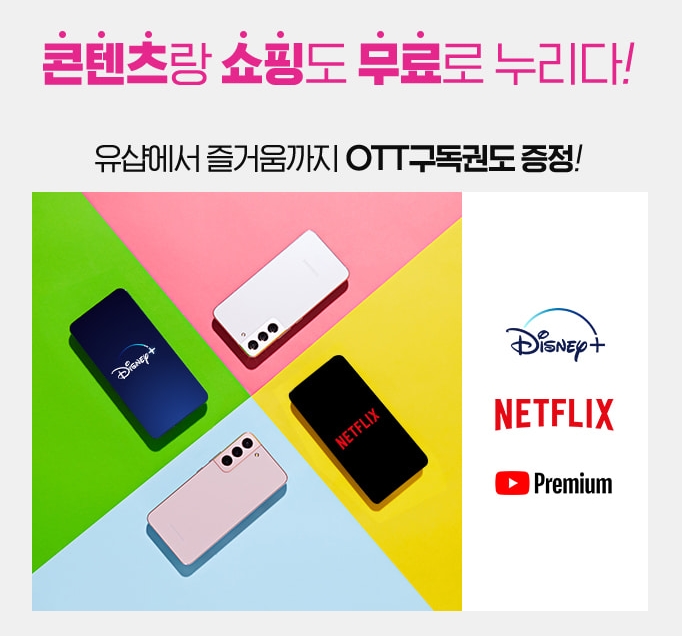 유샵에서 가입하면 디즈니플러스, 넷플릭스, 유튜브 프리미엄 구독권을 증정하고 매월 쇼핑 쿠폰팩 전원 증정(네이버페이, 옥션, 지마켓, GS25, 카카오택시, GS프레시몰, 요기요, 하나멤버스 중 택1) 혜택도 받을 수 있습니다(*5G 다이렉트 65 기준 2년간 최대 24만원 제휴 할인 쿠폰 지급).